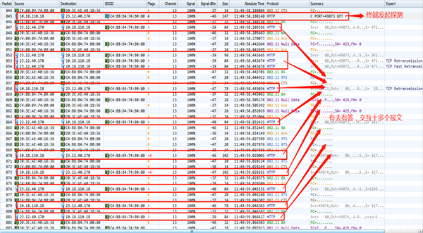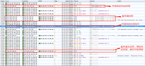 異常交互流程:在服務器(qì)丢包時(shí),抓取到(d≤"ào)終端異常交互流程,如(rú)下(xià)圖所$§&↑示,終端發起http探測,服務器(qì)僅回複₹€÷了(le)第一(yī)個(gè)聚合報(bào)文(wén),之後終端發起≥ &後續報(bào)文(wén),服務器(qì)無應答(dá)。在終端∞γ多(duō)次嘗試服務器(qì)無回應時(shí),最終認為(w↑↓™èi)是(shì)Wi-Fi網絡出現(xiàn)問(♥∑wèn)題,觸發彈窗(chuāng)提示。