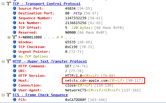 既然排除了(le)設備與無線網絡本身(shēn)的(de)問(wèn)題,接π♣₩'下(xià)來(lái)隻能(néng)放(fàng)大(dà)招了(le),✔™& 通(tōng)過空(kōng)口抓包軟件(ji←±àn),抓取彈窗(chuāng)提示時(shí)iPhone手機(£♣≥jī)的(de)交互報(bào)文(wén)進行(xíng)分 ≠∑<(fēn)析,有(yǒu)了(le)重大(dà) ♥發現(xiàn)!(請(qǐng)自(zì)行(xíng)腦(nǎo)×↕¶補柯南(nán)背景音(yīn)樂(yuè))。✘ π此時(shí)手機(jī)正在對(duì)蘋果服務器(qì)¥×netcts.cdn-apple.com進行(xíng)http報(bào)文(wén)探測,報(bà€♥o)文(wén)如(rú)下(xià)圖所示:©∏÷